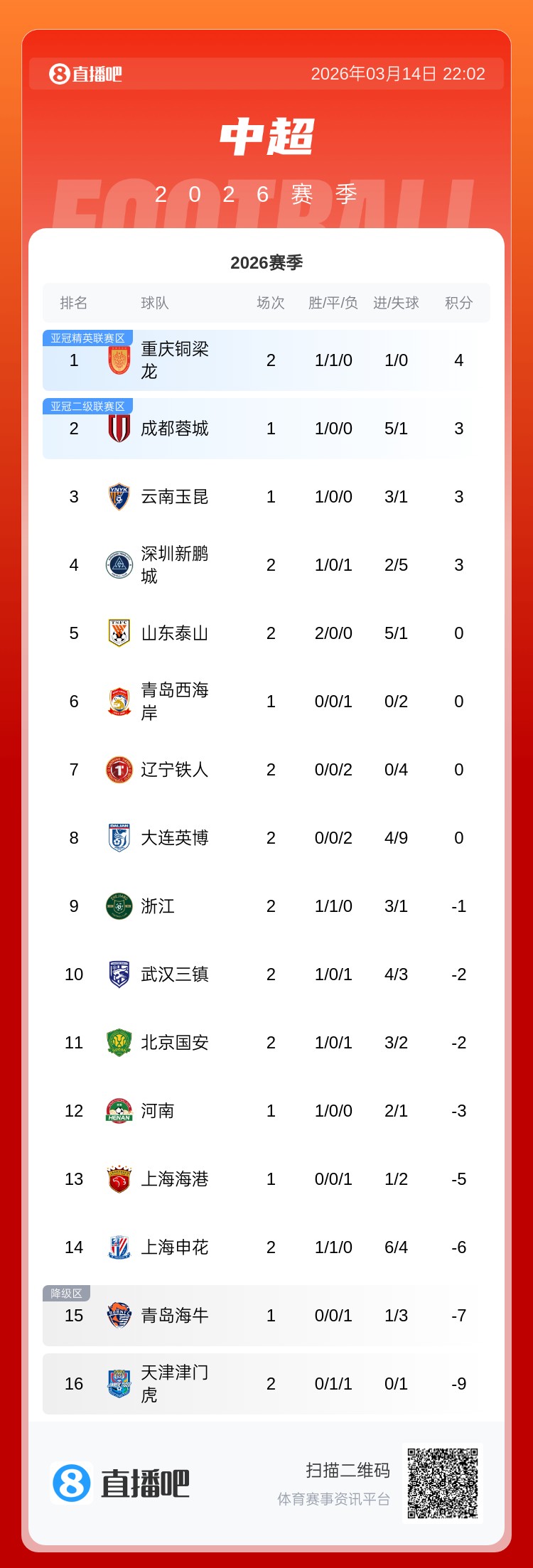 03月14日讯 中超第二轮,津门虎0-1不敌新鹏城,中超开季1平1负仍未取胜,目前负9分中超垫底。